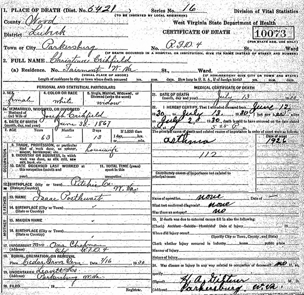 Born: Oct- -1848 in Greene Co, PA 1,2 Died: bef May 1910 3 Census: 1900 in Clay Co, WV Resided: 1879 in Doddridge Co, WV 2 Census: 1860 in Doddridge Co, (W)VA Father: John Critchfield, Jr. (1822 - ) Mother: Sarah Freeland ( - 1850)Wife: Christena Postlewaite Married: Oct- 9-1879 in Doddridge Co, WV 4 Born: Jun- -1863 in Ritchie Co, WV 1,2 (see note 1) Died: Jul-13-1930 in Parkersburg, Wood Co, WV 5 Buried: in Cedar Grove Cemetery, near Parkersburg, Wood Co, WV 5 Resided: in Fairmont, Marion Co, WV 5 Census: 1920 in Braxton Co, WV Census: 1910 in Jackson Co, WV Census: 1900 in Clay Co, WV Resided: 1879 in Doddridge Co, WV 2 Census: 1870 in Clay District, Ritchie Co, WV Father: Isaac Postleweight (1815 - ) Mother: Nancy Anderson (1831 - ) Notes