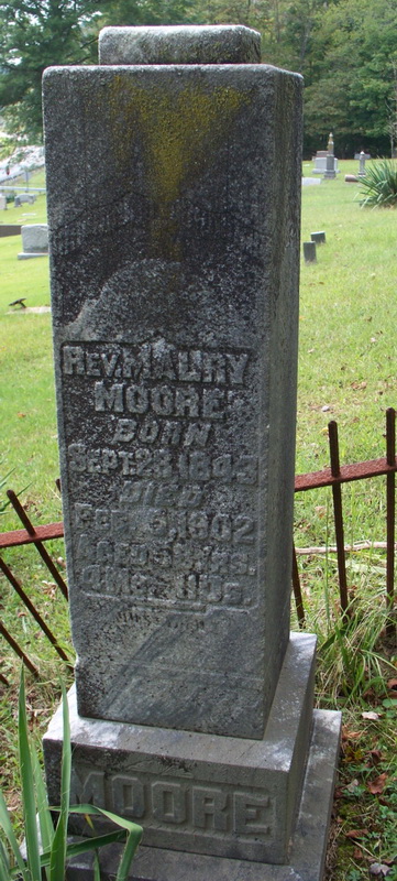 Husband: Malry Moore Also known as: Mallory Moore 1,2 Born: Sep-23-1843 3 (see note 1) Died: Feb- 5-1902 3 Buried: in Wolverton (aka Powell or new Victory) Cemetery, Waldo Run, Doddridge Co, WV 4,5 Census: 1870, 1880, 1900 in Grant District, Doddridge Co, WV Census: 1850, 1860 in Doddridge Co, (W)VA Occupation: minister 3 Occupation: 1900 farmer 6 Occupation: 1870, 1880 laborer 7 Military: 1861 - 1865 Pvt, Co M & L, 6th W.Va. Inf, Civil War 8,9,2,1,10 Father: Henry Moore (1816 - 1905) Mother: Elizabeth ___ (1824 - 1893) Other spouse 1
