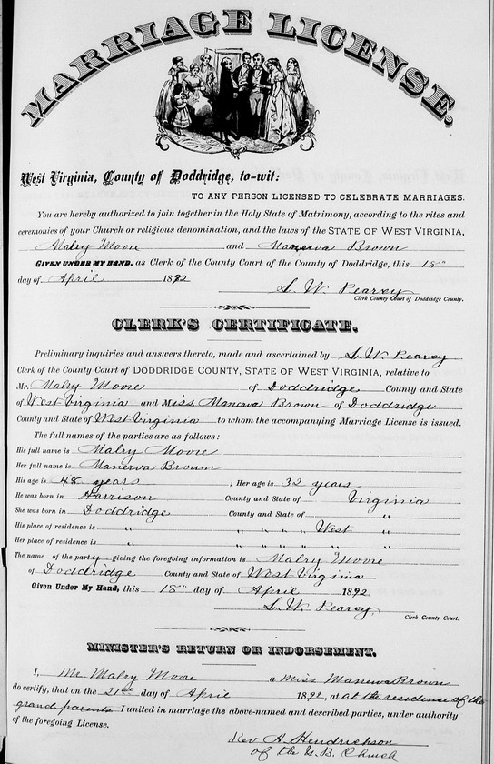 Sources: (1) U.S. Civil War Soldiers, 1861-1865 [database online], National Park Service , Ancestry.com. (2) U.S. Civil War Soldier Records and Profiles [database on-line], Ancestry.com. (3) Headstone. (4) Donald Edward Ramage, Doddridge County Cemeteries, Vol. I, 4117 Almaville Rd, Smyna TN 37167 (1988, rev. 1999) (5) Findagrave.com. (6) 1900 Census, Doddridge County, WV (Grant District) (7) 1880 Census, Doddridge County, WV (Grant District) (8) Doddridge County Marriage Records, West Union, WV. (9) U.S. Civil War Pension Index: General Index to Pension Files, 1861-1934 [database on-line], Ancestry.com and National Archives & Records Administration. (10) 1890 Veterans Schedules [database online], Ancestry.com and National Archives & Records Administration. (11) Marriage record of daughter. (12) West Virginia Births Index, 1853-1969 [database on-line], Ancestry.com. (13) Doddridge County Marriage Records, West Union, WV, Identified as Malry Moore, 48, b. Harrison Co, res. Doddridge Co; and Manerva Brown, 32, b. & res. in Doddridge Co. Married Apr 21 1892 "at the residence of the grandparents.", MR p. 199. (14) Headstone (year only) (15) Harrison County Marriage Records, Clarksburg, WV. (16) Cemeteries of Tenmile District, Harrison County, WV, Harrison County Genealogical Society, Clarksburg, WV (1989, revised 1995) (17) Death record of mother. (18) 1900 Census, Doddridge County, WV (Central District) (19) Obituary of wife's brother. Event Notes Note (1) Birthplace given as Harrison County in marriage record, but as Ohio in 1870 Census. Age 23 in 1870 would put birth in about 1847, but other census records conform to the 1843 date on his headstone. Note (2) Birth date given in 1900 Census as June 1892, but date on headstone is 1893.