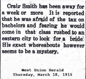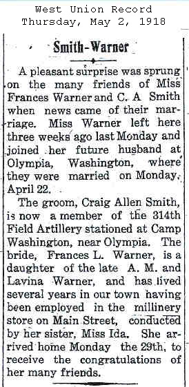 Jul-28-2018Husband: Craig Allen Smith Born: Feb- -1892 1,2 Died: Dec- 4-1922 in Weston, Lewis Co, WV 3,2 Buried: in Blockhouse Hill Cemetery (IOOF section), West Union, Doddridge Co, WV 4 Resided: 1918 near Olympia, Thurston Co, WA 5 (see note 1) Census: 1900 in West Union District, Doddridge Co, WV Occupation: bookkeeper 3 Occupation: 1916 Smith & Smith Hardware Store Military: 1918 314th Field Artillery, US Army, World War I 5 Father: Franklin Smith (1847 - 1933) Mother: Martha Jane Allen (1849 - 1936) Notes