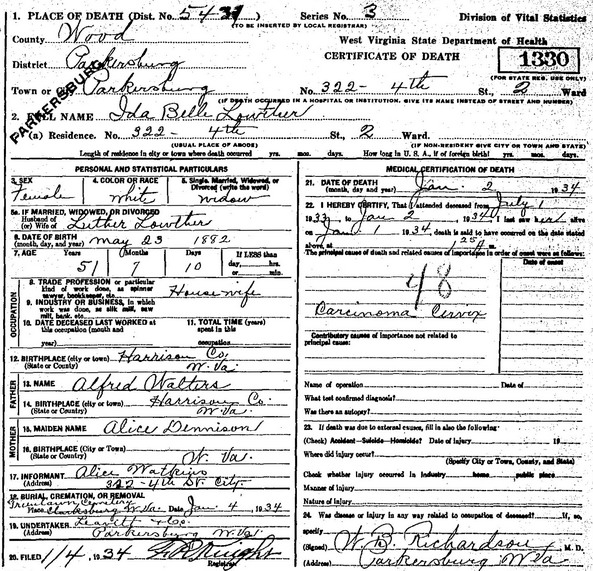 Sources: (1) Doddridge County Birth Records, West Union, WV, Identified as Luther Louther, b. Feb 25 1876, son of James Louther & M. BR Bk 1, p. 79. (2) Cemeteries of Coal District, Harrison County, WV, Harrison County Genealogical Society, Clarksburg, WV (1990) (3) 1910 Census, Harrison County, WV. (4) Harrison County WV Marriages 1895-1912, Wes Cochran, 2515 10th Ave, Parkersburg, WV 26101 (Feb 2001) (5) Harrison County WV Marriages 1895-1912, Wes Cochran, 2515 10th Ave, Parkersburg, WV 26101 (Feb 2001), Identified as Luther Lowther, 23, of Harrison Co, son of J. S. & Margaret F.; and Ida Belle Walter, 19, of Harrison Co, dau of A. & Martha A. Married may 23 1901. (6) WV State Dept of Health, Div of Vital Statistics, Death Certificate (http://www.wvculture.org/vrr/va_dcsearch.aspx)Name Index