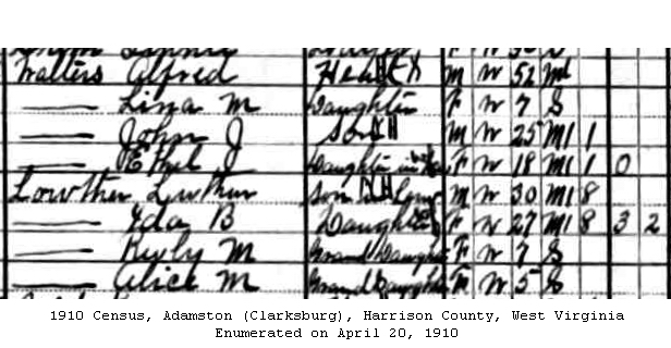 F Child 2: Alice M. Lowther Born: ca 1905 3 Census: 1910 in Adamston (Clarksburg), Harrison Co, WV