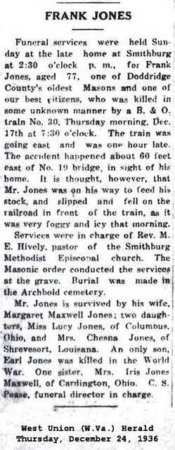 Jul-28-2018Husband: Benjamin Franklin Jones, Jr. Also known as: Frank Jones 1 Born: Jun- 8-1859 in Smithburg, Doddridge Co, WV 2,3,4 Died: Dec-17-1936 in Smithburg, Doddridge Co, WV 2,4 Buried: in Archbold Cemetery, Smithburg, Doddridge Co, WV 1,5,2 Cause of death: hit by train 2 Resided: in Smithburg, Doddridge Co, WV 2 Census: 1870 80, 1900 10 20 in West Union District, Doddridge Co, WV Census: 1860 in Doddridge Co, (W)VA Father: Benjamin Franklin Jones (1821 - 1895) Mother: Lucy Ann Burton (1824 - 1897)
