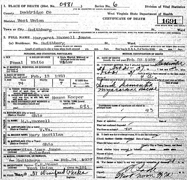 Wife: Margaret Rebecca Maxwell 6 Married: ca 1884 3 Born: Feb-13-1863 in Ohio 2,4 (see note 1) Died: Feb-22-1937 in Smithburg, Doddridge Co, WV 2,4 Buried: in Archbold Cemetery, Smithburg, Doddridge Co, WV 5,2 Resided: in Smithburg, Doddridge Co, WV 2 Census: 1900, 1910, 1920 in West Union District, Doddridge Co, WV Father: Meigs Lewis Maxwell (1823 - 1916) Mother: Margaret Ann McMillan (1824 - 1866) Notes