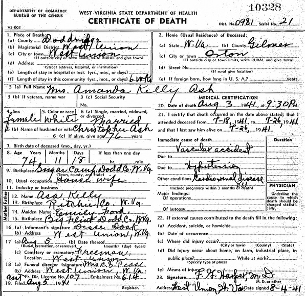 Born: Jan-20-1865 in Doddridge Co, WV 1,2,3 (see note 1) Died: Jan-26-1951 at Central Station, Doddridge Co, WV 1,2 Buried: in Freeman Cemetery, Piggin Run, West Union, Doddridge Co, WV 4 Resided: 1941 in Orton, Gilmer Co, WV 5 Resided: 1931 in Middlebourne, Tyler Co, WV 6 Census: 1910 in McClellan District, Doddridge Co, WV Census: 1880, 1900 in McElroy District, Tyler Co, WV Census: 1870 in Grant District, Doddridge Co, WV Occupation: farmer, teamster 1,7 Father: Adam Ash (1836 - 1920) Mother: Ellen Pinnell (1840 - 1931)Wife: Amanda Kelley 8,5 Married: Sep-26-1889 in Doddridge Co, WV 3 Born: Aug-16-1866 at Sugar Camp (New Milton), Doddridge Co, WV 8,9,3,10 Died: Aug- 3-1941 in West Union, Doddridge Co, WV 9 (see note 2) Buried: in Freeman Cemetery, Piggin Run, West Union, Doddridge Co, WV 9,4 Resided: in Orton, Gilmer Co, WV 9 Census: 1910 in McClellan District, Doddridge Co, WV Census: 1900 in McElroy District, Tyler Co, WV Census: 1870 in New Milton District, Doddridge Co, WV Father: Asa Kelley (1826 - 1900) Mother: Emily Ford (1827 - 1889)