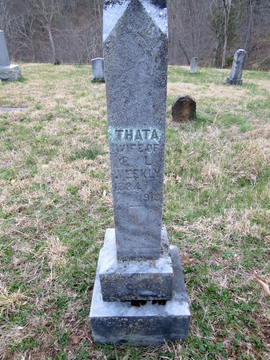 Sources: (1) Susie Davis Nicholson, Davis - The Settlers of Salem, West Virginia, Gordon Printing Co, Strasburg OH, 1979 (Revised & Enlarged) < www.wvgenweb.org/harrison/books.htm >, p. 130. (2) Record of wife's remarriage. (3) Doddridge County Death Records, West Union, WV. (4) Headstone. (5) Doddridge County Marriage Records, West Union, WV. (6) Headstone (year only) (7) Doddridge County Death Records, West Union, WV, Identified as Thata Davis Bonnell Weekley, white female, widow, age (obscured), died Feb 14 1913, cause of death pneumonia. (NOTE: "Davis - The Settlers of Salem, West Virginia," p. 130, reports death date as Feb 14 1913. But death record clearly shows it as Feb 14 1913, and date on headstone is also 1913. She is identified on her headstone as Thata Weekly, wife of R. L. Weekly.), DR p. 177 : www.wvculture.org/vrr/va_view.aspx?Id=5045429&Type=Death. (8) Findagrave.com. (9) Doddridge County WV Marriages 1845-1937, Wes Cochran, 156 Gihon Meadows, Apt 150, Parkersburg, WV 26101 (Jan 1993) (10) Obituary of son. (11) Death record of son. (12) 1900 Census, Doddridge County, WV (McClellan District) (13) West Virginia Deaths Index, 1853-1973 [database on-line], Ancestry.com. (14) West Virginia Marriages Index, 1785-1971 [database on-line], Ancestry.com. (15) U.S. Federal Census Mortality Schedules Index [database on-line], Ancestry.com. (16) Ritchie County Historical Society (David M. Scott, Editor), Ritchie County, West Virginia Cemeteries through 1993, McClain Printing Co, Parsons, WV, 1995. (17) 1930 Census, Wood County, WV. Event Notes Note (1) Listed as Philotheta Bonnell, 35, a domestic servant in the household of her second cousin Fenton F. Randolph and his family. Note (2) In household of Stephen & Sarah (Harper) Ash and their family.Name Index