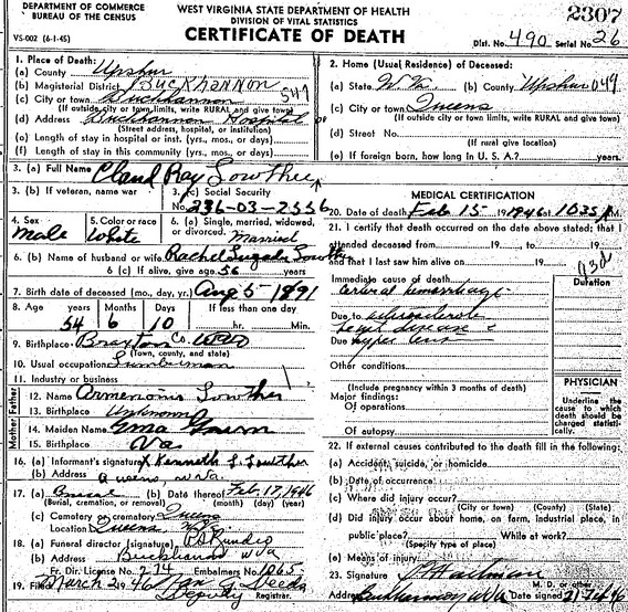 Jul-28-2018Husband: Claud Ray Lowther Born: Aug- 5-1891 in Braxton Co, WV 1,2 Died: Feb-15-1946 in Upshur Co, WV 1 Buried: in Queens Lanham Cemetery, Queens, Upshur County, WV 1 Resided: in Queens, Upshur Co, WV 1 Occupation: lumberman 1 Father: Arminus J. Lowther (1849 - ) Mother: Emily M. B. Gum (1857 - )