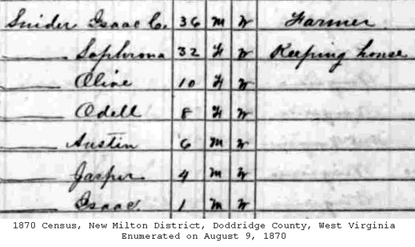 F Child 1: Olive Snider Born: ca 1861 1 Census: 1870 in New Milton District, Doddridge Co, WV Husband: William H. Ford b. ca 1857 Married: Sep-11-1879 in Doddridge Co, WV 1