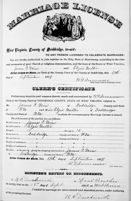 Sources: (1) Ritchie County WV Marriages 1945-1970, Wes Cochran, 2515 10th Ave, Parkersburg WV 26101 (Dec 2003) (2) WV State Dept of Health, Div of Vital Statistics, Death Certificate (http://www.wvculture.org/vrr/va_dcsearch.aspx) (3) WV State Dept of Health, Div of Vital Statistics, Death Certificate (http://www.wvculture.org/vrr/va_dcsearch.aspx). Informant: Lurena J. Davis, relationship not given. (4) Doddridge County Marriage Records, West Union, WV. (5) Ritchie County Marriage Records, Harrisville, WV, Identified as George Henry Darnell, widowed, 87, b. May 9 1861 in Tyler Co, res. Mole Hill WV, son of Aaron & Jane (Peirpoint) Darnell; and Elva Jane Bradford, widowed, 48, b. Apr 17 1900 in Ritchie Co, res. Ritchie Co, dau of Addison & Mary S. (Small) Nutter. Married Mar 5 1949 at the United Brethren Parsonage in Harrisvlle. MR p. 466 : http://www.wvculture.org/vrr/va_view.aspx?Id=11546514&Type=Marriage. (6) 1900 Census, Doddridge County, WV (Grant District) (7) Social Security Death Index. (8) Social Security Death Index, Social Security card issued in West Virginia before 1951. (9) Ritchie County WV Marriages 1916-1945, Wes Cochran, 2515 10th Ave, Parkersburg WV 26101 (Sep 1998)Name Index