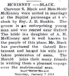 Jul-28-2018Husband: Clarence Sigler Black Born: Feb-28-1882 in Oxford, Doddridge Co, WV 1,2,3,4 Died: Nov- 9-1942 in Ritchie Co, WV 1,3 Buried: in Oxford Baptist Church Cemetery, Doddridge Co, WV 5,2 Resided: 1940 in Pullman, Ritchie Co, WV Census: 1920, 1930, 1940 in Union District, Ritchie Co, WV Resided: 1915 in Doddridge Co, WV 4 Census: 1910 in Pullman, Ritchie Co, WV 6 Census: 1900 in Union District, Ritchie Co, WV Occupation: farmer, county assessor 1 Occupation: 1930, 1940 Ritchie County assessor 7,8 Occupation: 1920 farmer 9 Occupation: 1915 operator of former Gatrell Restaurant in West Union 10 Occupation: 1910 team boss for Eureka Pipeline 6 Father: George P. Black (1836 - 1898) Mother: Martha Anne Sigler (1847 - 1918) Notes