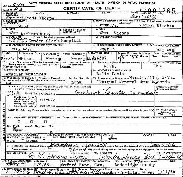 Wife: Mode McKinney 11 Married: Jan- 2-1915 in West Union, Doddridge Co, WV 4 Born: Oct-26-1887 in Doddridge Co, WV 12,13,3,4,14 Died: Jan- 6-1966 in Parkersburg, Wood Co, WV 12,3 Buried: in Oxford Baptist Church Cemetery, Doddridge Co, WV 12,2,5 Resided: in Vienna, Wood Co, WV 12 Resided: 1958, 1959 in Weirton, Hancock Co, WV 14,15 Census: 1920, 1930, 1940 in Union District, Ritchie Co, WV Resided: 1929 in Oxford, Ritchie Co, WV 16 Census: 1920 in Union District, Ritchie Co, WV Census: 1900 in West Union District, Doddridge Co, WV Father: Amaziah McKinney (1856 - 1932) Mother: Delia Ann Davis (1863 - 1929) Other spouse 2 Notes