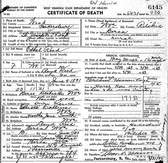 Born: Aug- 5-1883 in Ritchie Co, WV 1 (see note 1) Resided: 1945 near Berea, Ritchie Co, WV 2 Census: 1930 in Union District, Ritchie Co, WV Father: Edward J. Reed (1844 - 1925) Mother: Mary Elizabeth Fridley (1853 - 1923) Other spouse 2Wife: Ethel Collins Married: Aug-16-1913 in Ritchie Co, WV 3 Born: Jun- 9-1891 in Berea, Ritchie Co, WV 4,5 Died: May-30-1945 in Parkersburg, Wood Co, WV 4,5 Buried: in Spruce Creek Baptist Church Cemetery (Co Rd 34), Auburn, Ritchie Co, WV 4,6 Cause of death: horse riding accident (runaway horse on buggy she was driving) 4 Resided: near Berea, Ritchie Co, WV 4 Census: 1930 in Union District, Ritchie Co, WV Father: Elliott Collins (1866 - 1948) Mother: Martha Jane Smith (1868 - 1937)