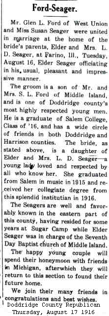 Wife: Susan May Seager Also known as: Susie May Seager 3 Married: Aug-15-1916 in Farina, Fayette Co, IL 4 Born: May-31-1892 at Lost Creek, Harrison Co, WV 1 Died: Jan-19-1977 in Grantsville, Calhoun Co, WV 1 Resided: in Buckhannon, Upshur Co, WV 1 Resided: formerly in West Union, Doddridge Co, WV 1 Education: Salem College (1915 & 1916, music degree) 2 Father: Lely D. Seager (1858 - 1933) Mother: Bianca Maxson (1863 - 1956)