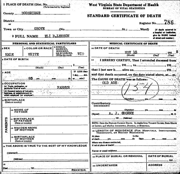 Sources: (1) 1900 Census, Doddridge County, WV (Southwest District) (2) Headstone (year only) (3) WV State Dept of Health, Div of Vital Statistics, Death Certificate (http://www.wvculture.org/vrr/va_dcsearch.aspx) (4) Headstone. (5) 1870 Census, Doddridge County, WV (South West Twp). (6) The History of Doddridge County, West Virginia, Taylor Publishing Co, 1979, p. 251. (7) Marriage record of son. (8) Death record of wife. (9) Doddridge County Marriage Records, West Union, WV, Groom identified as Eli B. Leason [sic], age 28, b. Harrison Co, Va., son of William & Nancy. Bride identified as Claundi [sic] McIntire, age 22, b. Harrison Co, Va, dau of Charles & Eliza. Ceremony held Dec 29 1861. The handwritten entry of the bride's name was immediately overwritten to reflect the above spellings, but even then the entry was not entirely clear. The name Claudia has also been offered as her name, but the entry does not appear to say that. Clarinda is the name that later is given at the births of her children. MR Bk 1-A, p. 138. (10) Doddridge County WV Marriages 1845-1937, Wes Cochran, 156 Gihon Meadows, Apt 150, Parkersburg, WV 26101 (Jan 1993) (11) Doddridge County Marriage Records, West Union, WV, MR Bk 1-A, p. 138. (12) Doddridge County Death Records, West Union, WV, DR Bk 3, p. 57. (13) Doddridge County Death Records, West Union, WV, Identified as Clarinda Leeson, b. Feb 27 1839, dau of Charles & Lizzie, d. Sep 18 1898, age 59y 7m 21d, wife of E. B. Leeson. Informant identified as E. B. Leeson, husband. DR Bk 3, p. 57. (14) Obituary. (15) Doddridge County Death Records, West Union, WV, DR Bk 2, p. 55. (16) Doddridge County WV Deaths 1853-1969, Wes Cochran, 156 Gihon Meadows, Apt 150, Parkersburg, WV 26101. (17) Obituary of wife. (18) Obituary of daughter. (19) Doddridge County Marriage Records, West Union, WV, Identified as Ashby L. Leeson, 25, b. Doddridge Co; and Minta Smith, 18, b. Doddridge Co. Ceremony held Jan 20 1889 "at J. W. Smith residence before witnesses." Informants: A. L. Leeson & J. W. Smith. MR Bk 3, p. 342. (20) West Virginia Marriage Records, 1863-1900 (http://www.ancestry.com/search/rectype/inddbs/4484.htm) (21) Doddridge County Marriage Records, West Union, WV, Groom identified as A. L. Leeson, age 58, b. Doddridge Co. Bride identified as Miss Nettie Reed, age 32, b. Doddridge Co. Ceremony held Apr 21 1925 "at A. L. Leeson's.", MR Bk 11, p. 401. (22) Doddridge County Birth Records, West Union, WV, Identified as Elisha Leeson, b. Jun 28 1865, son of Eli B. Leeson & Nancy [sic] Leeson. The mother's name was an apparent clerical error, as Nancy was the name of the father's mother. Elisha's marriage record in Sep 1900 gave his age as 28 (b. ca 1872), and his death record states his birth date as Jun 26 1868. But the 1870 Census of Doddridge County is consistent with his birth record, showing him as a four-year-old son in the household of Eli B. Leeson and Clarinda. BR Bk 1, p. 24. (23) 1920 Census, Harrison County, WV. (24) Obituary of brother. (25) Doddridge County WV Marriages 1845-1937, Wes Cochran, 156 Gihon Meadows, Apt 150, Parkersburg, WV 26101 (Jan 1993), Identified as Elisha M. Leeson, 28, of Doddridge Co; and Drusilla Jane Richards, 18, of Doddridge Co. Married Sep 9 1900. (26) Obituary of sister. (27) Doddridge County Birth Records, West Union, WV, Identified as Theodore Leeson, b. Jun 2 1867, son of Eli B. & Clarinda Leeson. BR Bk 1, p. 34. (28) Doddridge County Marriage Records, West Union, WV, Groom identified as Theodore Leeson, age 27, b. Doddridge Co. Bride identified as Emma J. Moran, age 17, b. Doddridge Co. Married Jul 24 1895 at Grove. Informants: William Moran & Theodore Leeson. MR Bk 5, p. 73. (29) Obituary of husband. (30) Obituary of wife's brother. (31) Obituary of son. (32) West Union WV Cemeteries (Doddridge County), Wes Cochran, 2515 10th Ave, Parkersburg, WV 26101 (July 1990) (33) Doddridge County Marriage Records, West Union, WV, MR Bk 4, p. 161. (34) Doddridge County Birth Records, West Union, WV, Identified as Cora B. Leeson, b. Jun 10 1872, dau of Eli B. & Clarinda Leeson. BR Bk 1, p. 56. (35) Harrison County Marriage Records, Clarksburg, WV. (36) Harrison County Marriage Records, Clarksburg, WV, Identified as George W. Watson, widowed, 37, b. Gilmer Co, res. Harrison Co, son of Enoch & Ellen Watson; and Miss Cora Leason, single, 25, b. Doddridge Co, res. Harrison Co, dau of Eli & Cololinda Leason. Married Oct 26 1902 at Goff ME Church, Clarksburg, W.Va. MR p. 262. (37) Doddridge County WV Marriages 1845-1937, Wes Cochran, 156 Gihon Meadows, Apt 150, Parkersburg, WV 26101 (Jan 1993), Participants identified as J. John Terpstra, age 33, born in Freesland? [sic], resident of Bon Homme Co, SD; and Mrs. Cora Watson, age 32. Ceremony held Jan 13 1913 in Doddridge Co. In view of her documented birth date of Jun 10 1872, her actual age at the time would have been 40. Spelling of his name given as "Terpstra" here, but as "Terpestra" in History of Doddridge County. (38) Doddridge County Birth Records, West Union, WV, Identified as Hattie C. Leeson, dau of Eli B. & Clarinda L. Leeson. Born May 20 1875. Person providing information for the record identified as Ida E. Leeson, sister of the child. BR Bk 1, p. 74. (39) Obituary - At home. (40) Birth record of son. (41) 1880 Census, Doddridge County, WV (Southwest District). (42) Doddridge County Marriage Records, West Union, WV, Identified as Henry J. Smith, 27, b. & res. in Doddridge Co; and Hattie Leeson, 22, b. & res. in Doddridge Co. Married Nov 24 1901 at the bride's residence. MR p. 399 : http://www.wvculture.org/vrr/va_view.aspx?Id=11793933&Type=Marriage. (43) Doddridge County Birth Records, West Union, WV, Identified as Hannah L. Leeson, b. Jun 15 1878, dau of Eli B. Leeson & Clorinda. BR Bk 1, p. 96. (44) Doddridge County Birth Records, West Union, WV, Identified as Murtle Leeson, b. Apr 10 1882, dau of Eli B. Leeson & Caroline [sic]. BR Bk 1, p. 121. (45) Ritchie County WV Marriages 1843-1915, We