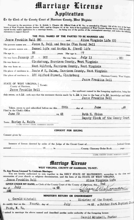 Sources: (1) Obituary of son. (2) West Virginia Births Index, 1853-1969 [database on-line], Ancestry.com. (3) Harrison County Marriage Records, Clarksburg, WV. (4) Social Security Death Index. (5) Social Security Death Index, Social Security card issued in West Virginia before 1951. (6) U.S. Public Records Index, Vol 1, Ancestry.com. (7) Birth record of son. (8) Dirigo, Salem College Yearbook, 1948. (9) Newspaper article. (10) Harrison County Marriage Records, Clarksburg, WV, Identified as Jesse Franklin Bell, widowed, b. Jan 17 1922 in Clarksburg, res. Salem, son of Jesse H. Bell & Bessie Van Horn; and Alice Virginia Life, single, b. Jul 13 1920 in West Milford, res. Clarksburg, dau of Samuel Life & Martha M. Reed. Married Jul 4 1948 at Nutter Fort. (11) Obituary of husband.Name Index