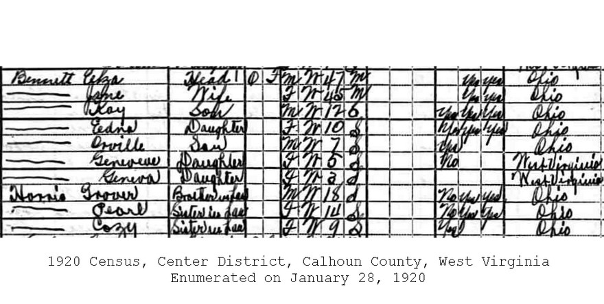 M Child 3: Orval C. Bennett Born: Apr-15-1912 10 Died: Jan-17-1997 10 Resided: in Parkersburg, Wood Co, WV 18 Census: 1920, 1930 in Calhoun Co, WV
