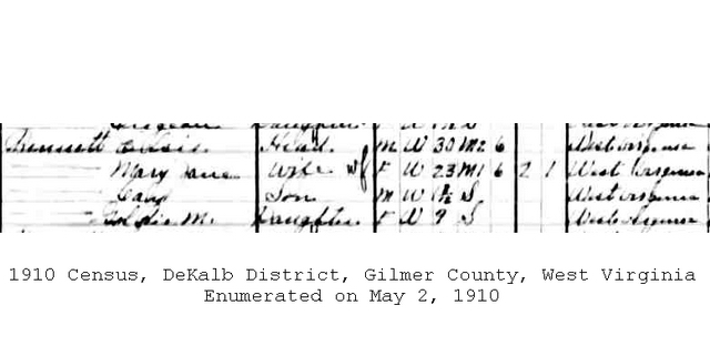 Sources: (1) 1920 Census, Calhoun County, WV. (2) Obituary of daughter. (3) Marriage record of son. (4) 1900 Census, Calhoun County, WV. (5) Gilmer County Marriage Records, Glenville, WV. (6) Calhoun County Marriage Records, Grantsville, WV. (7) Gilmer County Marriage Records, Glenville, WV, Identified as Lewis E. Bennett, widowed, 24, b. Calhoun Co, res. Gilmer Co; and Jane Harris, single, 17, b. & res. in Gilmer Co. Married Nov 13 1903. MR p. 73. (8) 1900 Census, Gilmer County, WV (DeKalb District) (9) 1920 Census, Gilmer County, WV. (10) Social Security Death Index. (11) Social Security Death Index, Social Security card issued in Maryland before 1951. (12) Polly Walker Kreaps, Walker WV 26180,, Walker Family GEDCOM (http://txnetwork.net/walker/gedcoms/pkreaps/html/pkreaps.html) (13) Death Record - Online, Ohio Death Index, Certificate 093840. (14) Headstone. (15) Calhoun County Historical & Genealogical Society, Cemeteries in Calhoun County West Virginia, Grantsville Printing Co, Grantsville WV (1985) (16) Death Record - Online. (17) Social Security Death Index, Social Security card issued in West Virginia in 1964. (18) Social Security Death Index, Social Security card issued in West Virginia before 1951. (19) Obituary of half-brother. (20) Obituary. (21) Obituary - Hospital. (22) Obituary of husband. (23) Obituary of stepson. (24) Obituary of son. Event Notes Note (1) headstone incorrectly shows death date as 1982 Name Index