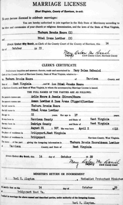 Wife: Ethel Irene Lowther Married: Oct-14-1929 in Bridgeport, Harrison Co, WV 1
