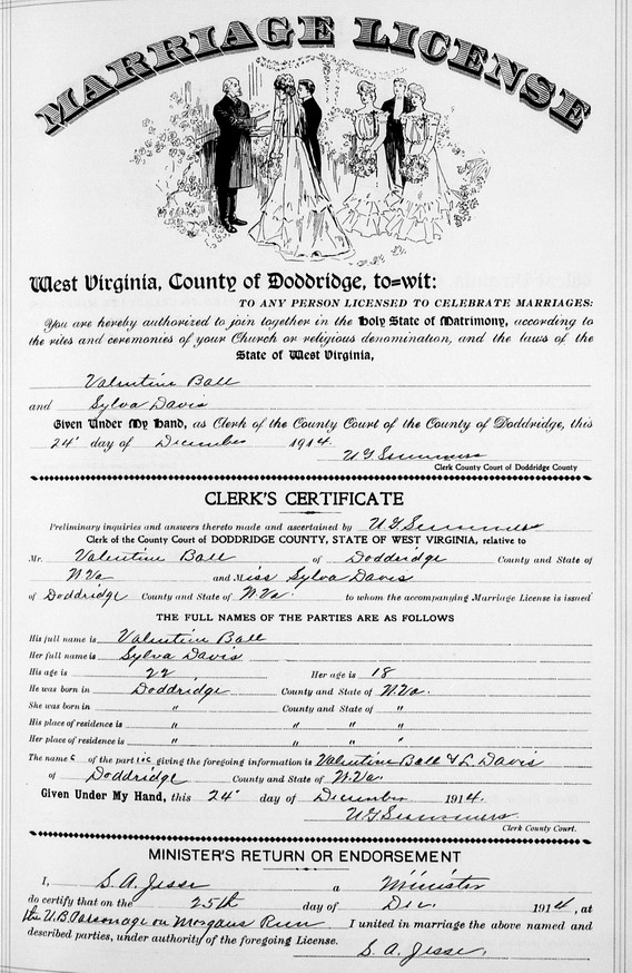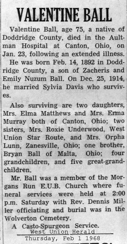 Sources: (1) West Virginia Births Index, 1853-1969 [database on-line], Ancestry.com. (2) Social Security Death Index. (3) 1900 Census, Doddridge County, WV (Grant District) (4) Headstone (year only) (5) Obituary - Hospital. (6) Ohio Deaths, 1908-1932, 1938-1944, and 1958-2007 (online), Ancestry.com and Ohio Department of Health. (7) Donald Edward Ramage, Doddridge County Cemeteries, Vol. I, 4117 Almaville Rd, Smyna TN 37167 (1988, rev. 1999) (8) Findagrave.com. (9) Social Security Death Index, Social Security card issued in West Virginia before 1951. (10) 1940 Census, Doddridge County, WV (Grant District) (11) 1920 Census, Doddridge County, WV (Grant District). (12) 1930 Census, Doddridge County, WV (Grant District). (13) Doddridge County Marriage Records, West Union, WV, Identified as Mr. Valentine Ball, 22, b. & res. in Doddridge Co; and Miss Sylva Davis, 18, b. & res. in Doddridge Co. Married Dec 25 1914 "at the U.B. Parsonage on Morgans Run." Informants for the marriage license: Valentine Ball & L. Davis. MR p. 357. (14) Wade H. Coffindaffer Jr. (1918-1991), Clarksburg, WV, Descendants of Thomas and Elizabeth Dye Ford (Self-published, July 1991), p. 7. (15) Doddridge County Marriage Records, West Union, WV. (16) Obituary of father. (17) Headstone. (18) Doddridge County Death Records, West Union, WV, DR p. 7 : www.wvculture.org/vrr/va_view.aspx?Id=5044874&Type=Death. (19) Doddridge County Republican, Local news item, "Doddridge County Republican," Thursday, Nov 18 1915, in its entirety: "On last Tuesday, death entered the home of Mr. and Mrs. Valentine Ball on Morgans Run and claimed their two-weeks-old infant child. The funeral services were conducted Wednesday." (NOTE: Doddridge County death records show an unnamed Ball, a "farmer's child" whose gender and parents were not given, age 6 days, who died at Morgansville of "infantile ailments" on Nov 10 1915. That date was a Wednesday. In this case, it appears that the more specific newspaper account is in error. The child's headstone, which shows his name as Victor Ball, is in agreement with the death record, shows his birth date Nov 3 1915, and his death date Nov 10 1915.) (20) Doddridge County WV Marriages 1845-1937, Wes Cochran, 156 Gihon Meadows, Apt 150, Parkersburg, WV 26101 (Jan 1993) Event Notes Note (1) Birth date given in obituary and WW I draft registration as Feb 14 1892, but WV Births Index and SSDI show it as Feb 15 1882. Note (2) Local news item in the "Harlin News" column, "West Union Herald," Thursday, Oct 26 1916, in its entirety: "Born unto Mr. and Mrs. Valentine Ball, October 18 1916, a fine baby girl."Name Index