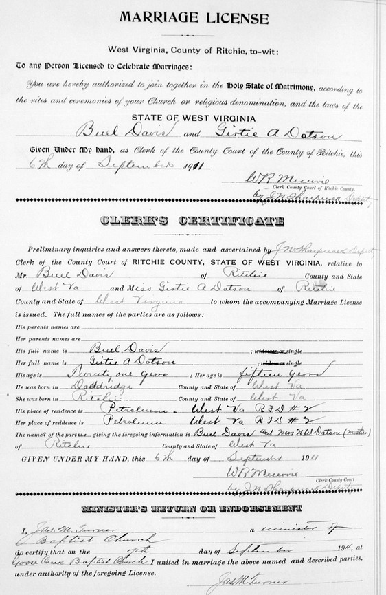 Wife: Gertie Agnes Dotson 3,4 Also known as: Girtie A. Dotson 1 Married: Sep- 7-1911 at Goose Creek, Ritchie Co, WV 1