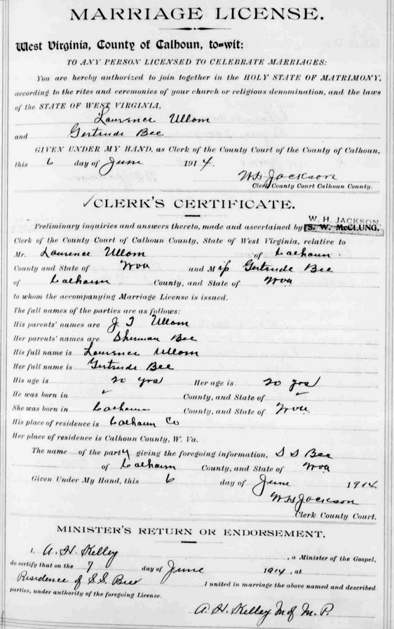 Sources: (1) Calhoun County WV Marriages 1856-1927, Wes Cochran, 2515 10th Ave, Parkersburg, WV 26101 (Oct 1989) (2) Calhoun County Marriage Records, Grantsville, WV, Identified as Laurence Ullom, 20, b. in (blank), res. Calhoun Co, son of J. T. Ullom; and Gertrude Bee, 20, b. & res. in Calhoun Co, dau of Sherman Bee. Married Jun 7 1914 "at Residence of S. S. Bee." Informant for marriage license: S. S. Bee. MR p. 153 : http://www.wvculture.org/vrr/va_view.aspx?Id=803&Type=Marriage. (3) Wood County Marriage Records, Parkersburg, WV. (4) Social Security Death Index. (5) Social Security Death Index, Social Security card issued in West Virginia before 1951. Name in SSDI: Gertrude Ullom. (6) 1920 Census, Wood County, WV. (7) Social Security Death Index, Social Security card issued in West Virginia before 1951. (8) Pleasants County Marriage Records, St. Marys, WV.Name Index