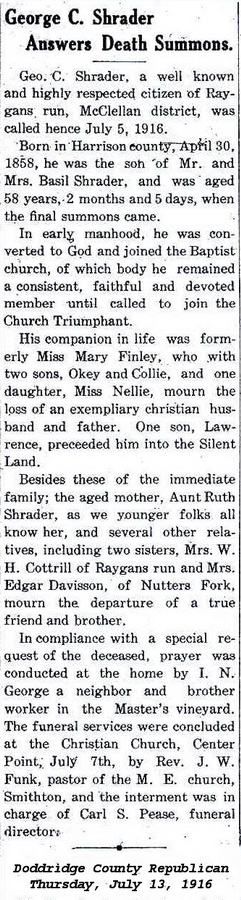 Jul-28-2018Husband: George Cicero Shrader Born: Apr-30-1858 in Tenmile District, Harrison Co, (W)VA 1,2,3,4,5,6 Died: Jul- 5-1916 at Raygans Run, McClellan District, Doddridge Co, WV 2,4 Buried: in Center Point Christian Church Cemetery, Doddridge Co, WV 2,7 Resided: at Raygans Run, McClellan District, Doddridge Co, WV 2 Census: 1900, 1910 in McClellan District, Doddridge Co, WV Resided: 1887 in Doddridge Co, WV 5 Occupation: farmer 8 Father: Bassil Taylor Shrader ( - 1900) Mother: Ruth Roberts (1832 - 1918)