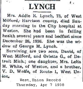 Sources: (1) WV State Dept of Health, Div of Vital Statistics, Death Certificate (http://www.wvculture.org/vrr/va_dcsearch.aspx) (2) 1870 Census, Harrison County, WV. (3) Harrison County Marriage Records, Clarksburg, WV. (4) Death record of husband. (5) Obituary of wife. (6) Obituary. (7) Harrison County Marriage Records, Clarksburg, WV, Identified as George M. Lynch, widowed, 27, b. & res. in Harrison Co, farmer, son of Isaac & Mary J. Lynch; and Adda R. Wolf, single, 24, b. & res. in Harrison Co, dau of A. E. & Virginia L. Wolf. Married Mar 21 1889. (8) Doris Kimball "Dee" Puffer, Descendants of Isaac Leggett. (9) Obituary - Hospital, West Union Record, Thursday, Apr 7 1938. Name Index
