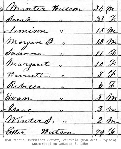 Jul-28-2018Husband: Winter S. Hutson Born: Apr- 6-1814 in Harrison Co, (W)VA 1,2 Died: Jul-10-1894 in Doddridge Co, WV 3,1 Buried: in Seventh Day Baptist Church Cemetery, Salem, Harrison Co, WV 1 Census: 1880 in McClellan District, Doddridge Co, WV 1 Census: 1850 in Doddridge Co, (W)VA Father: John Hutson Mother: Esther Davis (1771 - ) Other spouse 2