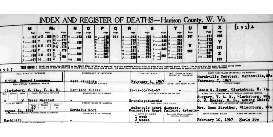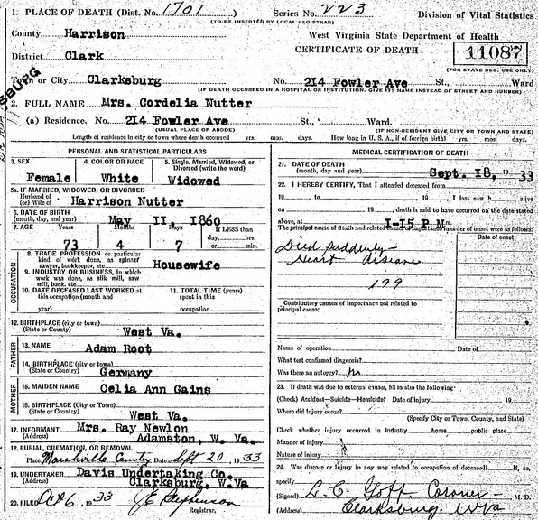 Sources: (1) Marriage record of daughter. (2) 1900 Census, Harrison County, WV. (3) Headstone (year only) (4) Harrison County Marriage Records, Clarksburg, WV. (5) Cemeteries of Tenmile District, Harrison County, WV, Harrison County Genealogical Society, Clarksburg, WV (1989, revised 1995) (6) Death record of wife. (7) Death record of son. (8) WV State Dept of Health, Div of Vital Statistics, Death Certificate (http://www.wvculture.org/vrr/va_dcsearch.aspx) (9) Harrison County Marriage Records, Clarksburg, WV, Identified as Harrison Nutter, widowed, 37, b. & res. in Harrison Co, son of Abram & Harriet Nutter; and Mrs. Cordelia Strother, widowed, 32, b. & res. in Harrison Co, dau of Jacob & Emily Root. Married Nov 15 1892 at Adamston School House in Harrison County by J. W. Flanagan, Minister of M. E. Church. MR p. 292. (10) Headstone. (11) Cemeteries of Tenmile District, Harrison County, WV, Harrison County Genealogical Society, Clarksburg, WV (1989, revised 1995), Identified as K. Cordelia Root Strother Nutter (wife of Harrison). (12) Social Security Death Index. (13) Findagrave.com. (14) Death record of brother. (15) Harrison County Marriage Records, Clarksburg, WV, MR p. 292. (16) National Archives and Records Administration, World War II Draft Registration Cards, 1942 (Ancestry.com online database) (17) 1930 Census, Harrison County, WV. (18) Military Grave Marker. (19) Harrison County Death Records, Clarksburg, WV. (20) Social Security Death Index, Social Security card issued in West Virginia before 1951. Event Notes Note (1) Birth date given in death record as Aug 24 1899, as does headstone. But 1900 Census shows it as Aug 1898, and SSDI states Aug 24 1898. Note (2) In household of brother Jasper.Name Index