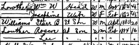 Jul-28-2018Husband: William W. Lowther Born: Oct- -1854 in Ritchie Co, (W)VA 1,2,3 Resided: 1911 in Fresno Co, CA 3 Census: 1900 in Fresno Co, CA Resided: in the West 4 Occupation: carpenter, painter 1 Father: Napoleon B. Lowther (1815 - 1906) Mother: Mary Jane Ireland (1828 - 1906) Other spouse 2 Notes
