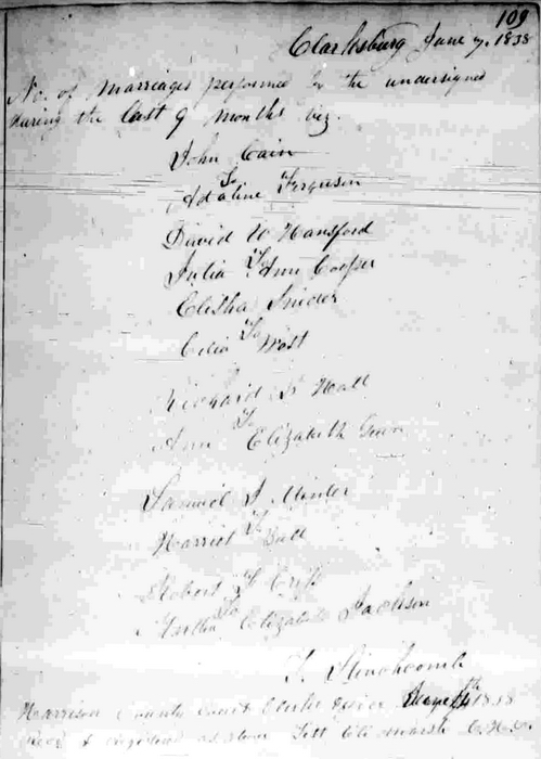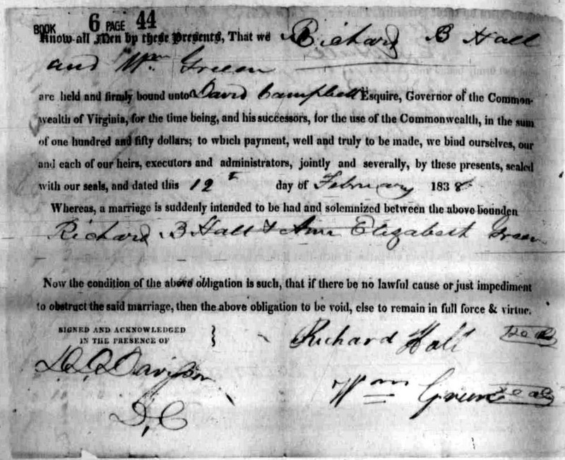 Wife: Ann Elizabeth Green 1 Married: 1838 in Harrison Co, (W)VA 2 Marriage Bond: Feb-12-1838 in Harrison Co, (W)VA 2 Born: in Freemansburg, Lewis Co, WV 1 Father: Mother: