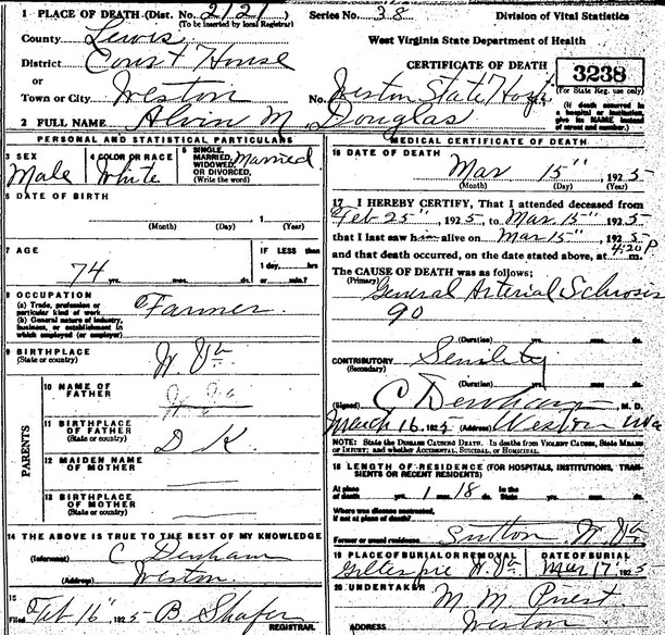 Jul-28-2018Husband: Alvin Markwood Douglass Also known as: Alvin M. Douglas 1 Born: ca 1851 1 Died: Mar-15-1925 in Weston, Lewis Co, WV 1 Buried: in Gillespie (Harrisville), Ritchie Co, WV 1 Father: Levi D. Douglass (1809 - 1882) Mother: Malinda Jane Nutter