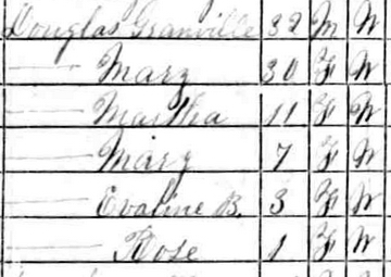 F Child 1: Martha Jane Douglass Born: ca 1859 4 Census: 1880 in Allegheny Co, PA Census: 1870 in White Oak, Allegheny Co, PA Census: 1860 in Harrison Co, (W)VA 4 Occupation: dress maker 3