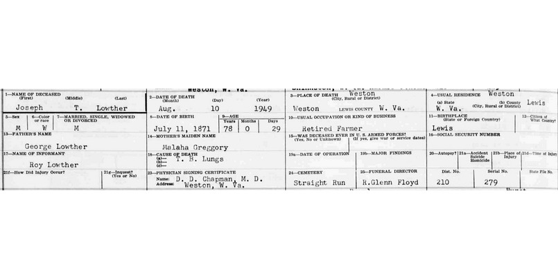 Jul-28-2018Husband: Joseph Thomas Lowther Born: Jul-11-1871 in Lewis Co, WV 1 (see note 1) Died: Aug-10-1949 in Weston, Lewis Co, WV 1 Buried: in Straight Run Cemetery, Hurst, Lewis Co, WV 1 Resided: in Weston, Lewis Co, WV 1,2 Census: 1900, 1930 in Freemans Creek District, Lewis Co, WV Occupation: farmer 1 Father: George W. Lowther (1840 - 1896) Mother: Mahala Gregory (1839 - 1928) Other spouse 2
