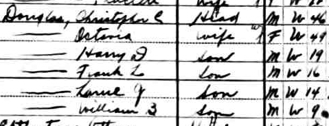 Jul-28-2018Husband: Christopher Columbus Douglass Also known as: Columbus C. Douglass 1 Born: Apr-30-1863 in Doddridge Co, (W)VA 2 Died: Mar-17-1925 in San Antonio, Bexar Co, TX 2 Buried: in St. Louis, MO 2 Resided: in San Antonio, Bexar Co, TX 2 Resided: 1921 in St. Louis, MO 3 (see note 1) Census: 1910, 1920 in St. Louis, MO Census: 1900 in Parkersburg, Wood Co, WV Census: 1880 in Central District, Doddridge Co, WV Occupation: 1920 city building inspector 4 Occupation: 1900, 1910 carpenter, city building inspector 5,6 Father: Samuel Hall Douglass (1834 - 1909) Mother: Sarah H. Frum (1833 - 1899)