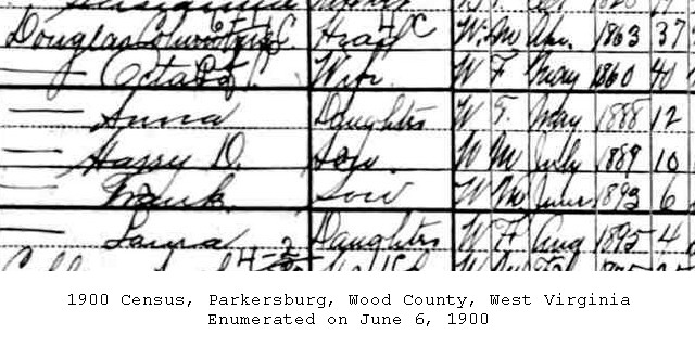 F Child 1: Anna Douglass Born: May- -1888 5 Census: 1900 in Parkersburg, Wood Co, WV