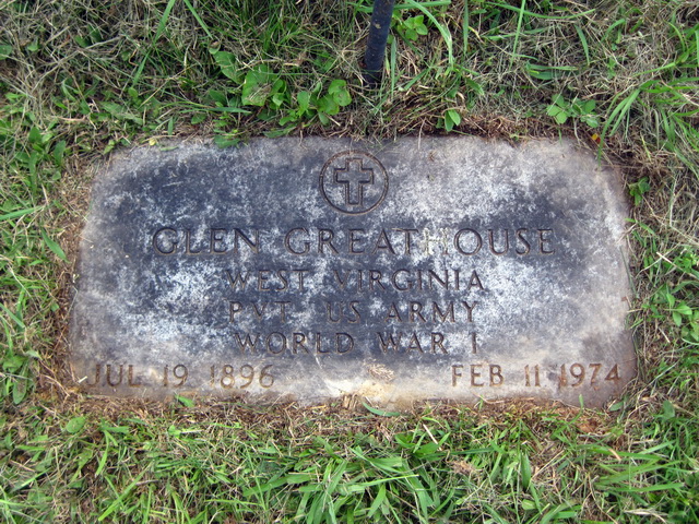 Jul-28-2018Husband: Glen Greathouse Census name: Glenn Greathouse Born: Jul-19-1896 at Center Point, Doddridge Co, WV 1,2,3 Died: Feb-11-1974 2,3 Buried: in Middle Island 7th Day Bapt Cem, Sugar Camp, New Milton, Doddridge Co WV 3,4 Resided: in New Milton, Doddridge Co, WV 5 Census: 1910, 20, 30, 40 in New Milton, Doddridge Co, WV Census: 1900 in Greenbrier District, Doddridge Co, WV Occupation: pumper in oil fields 6,7 Military: Aug-28-1918 - Mar-18-1919 Pvt, US Army, World War I 3,8 Father: Enos Simon Greathouse (1867 - 1946) Mother: Isabella Cordelia "Delia" Kelley (1868 - 1906)