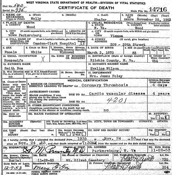 Born: ca 1868 in Monongalia Co, WV 1 Died: bef Nov 1953 2 Resided: 1894 in Ritchie Co, WV 1 Father: Mother:Wife: Molly Bee Also known as: Mollie Bee 1,3 Married: May-14-1894 in Ritchie Co, WV 1 Born: Mar- 3-1870 in Ritchie Co, WV 4 Died: Nov-25-1953 in Parkersburg, Wood Co, WV 4 Buried: in Mt. Olivet Cemetery, Parkersburg, Wood Co, WV 4 Resided: in Vienna, Wood Co, WV 4 Father: Augustus J. Smith Bee (1837 - 1885) Mother: Eveline Wilson (1836 - 1920)