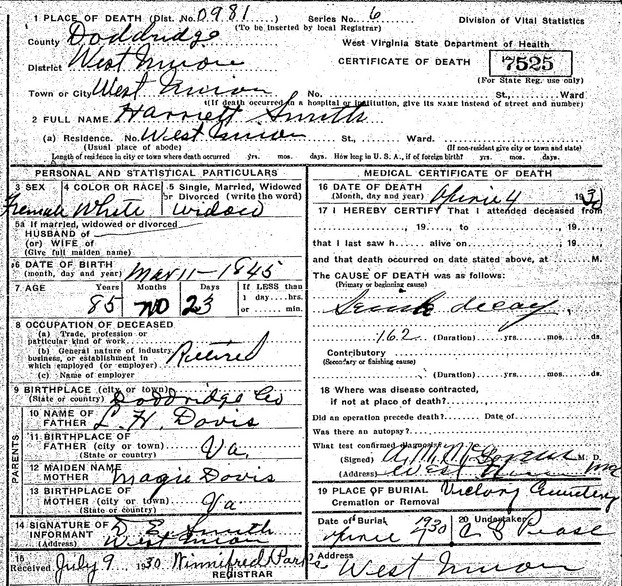 Wife: Harriet E. Davis Married: Mar-24-1864 in Doddridge Co, WV 2 Born: Mar-11-1845 in Harrison Co, (W)VA 2,1 Died: Apr- 4-1930 in Doddridge Co, WV 4,5 Buried: in Wolverton (aka Powell or new Victory) Cemetery, Waldo Run, Doddridge Co, WV 1 Census: 1930 in Wabash (West Union), Doddridge Co, WV Census: 1880, 1900, 1910 in Grant District, Doddridge Co, WV Resided: 1864 in Doddridge Co, WV 2 Census: 1860 in Doddridge Co, (W)VA Father: Lodowick Hughes Davis (1816 - 1885) Mother: Margaret Davis (1817 - 1895)