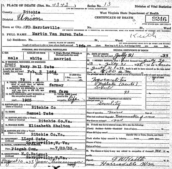 Jul-28-2018Husband: Martin Van Buren Tate Also known as: Van Tate 1 Born: Feb- 3-1854 in Ritchie Co, (W)VA 2,3 Died: Jul-21-1933 near Harrisville, Ritchie Co, WV 2,3 Buried: in Mt. Pisgah Cemetery, near Pullman (Co Rds 9 & 7/4), Ritchie Co, WV 4,2 Occupation: farmer 2 Father: Samuel Tate (1827 - ) Mother: Elizabeth Shelton (1830 - )