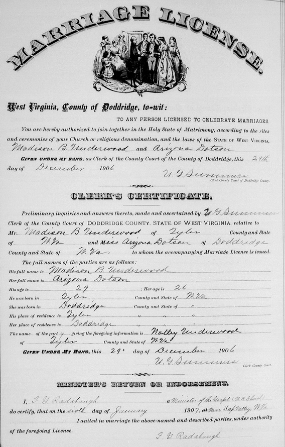 Wife: Arizona Dotson Married: Jan- 6-1907 in Doddridge Co, WV 6 Born: Apr- -1881 in Doddridge Co, WV 7,8 Died: Mar- 6-1910 at Central Station, Doddridge Co, WV 9 Buried: (no dates) in Arnolds Creek Christian Church Cem, Greenwood (Deep Valley), Doddridge Co, WV 10 Cause of death: blood poisoning 9 Census: 1900 in Central District, Doddridge Co, WV Father: James J. Dotson (1834 - ) Mother: Columbia Jane Greathouse (1841 - )