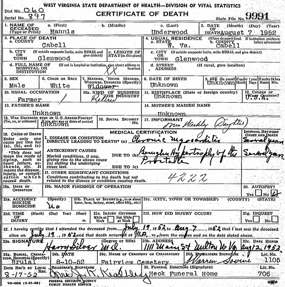 Jul-28-2018Husband: Madison Blaine Underwood Born: Mar-11-1880 in Tyler Co, WV 1 (see note 1) Died: Aug- 7-1952 in Cabell Co, WV 2 Resided: 1942 in Lesage, Cabell Co, WV 3 Resided: 1918 in Central Station, Doddridge Co, WV 4 Resided: 1907, 1911 in Tyler Co, WV 5 Census: 1880 in McElroy District, Tyler Co, WV Occupation: 1918 connection man for Pittsburgh & W.Va. Gas Co. 4 Father: Notley Underwood (1853 - 1924) Mother: Harriet Ann Harris (1857 - 1884) Other spouse 2 Other spouse 3