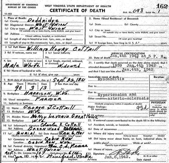 Jul-28-2018Husband: William Henry Cottrill Born: Sep-22-1851 in Harrison Co, (W)VA 1 Died: Jan- 4-1942 in West Union, Doddridge Co, WV 1,2 Buried: in Cabin Run Cemetery, Doddridge Co, WV 1 Resided: 1932 in Greenwood, Doddridge Co, WV 3,4 Census: 1910 at Sunnyside (West Union), Doddridge Co, WV 5 Census: 1900 in West Union District, Doddridge Co, WV Occupation: farmer 1 Occupation: 1910 manager of County Farm (poor house) 5 Father: George Jefferson Cottrill (1830 - 1913) Mother: Nancy Lovinia Greathouse (1835 - 1926) Other spouse 1 Notes