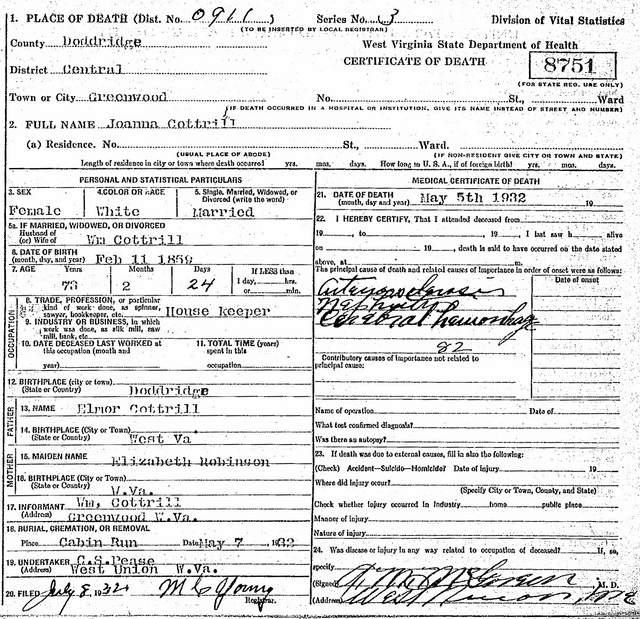 Wife: Joanna Cottrill Married: May-24-1883 in Doddridge Co, WV 6 Born: Feb-11-1859 in Harrison Co, (W)VA 1,7,8 (see note 1) Died: May- 5-1932 in Greenwood Cemetery, Greenwood, Doddridge Co, WV 1,7 Buried: in Cabin Run Cemetery, Doddridge Co, WV 1 Census: 1910 at Sunnyside (West Union), Doddridge Co, WV 5 Census: 1900 in West Union District, Doddridge Co, WV Census: 1860 in Doddridge Co, (W)VA Resided: 1883 in Doddridge Co, WV 8 Father: Elmore Cottrill (1830 - 1893) Mother: Elizabeth Robinson (1836 - )