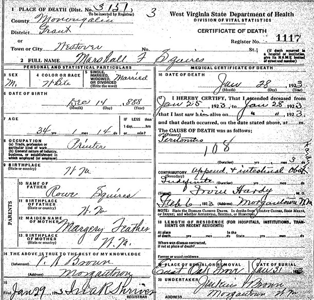 Jul-28-2018Husband: Marshall Franklin Squires Born: Dec-14-1888 1,2 Died: Jan- 9-1923 in Westover, Monongalia Co, WV 1,2 Buried: in East Oak Grove Cemetery, Morgantown, Monongalia Co, WV 1 Cause of death: peritonitis 1 Resided: in Morgantown, Monongalia Co, WV 3 Census: 1920 in Morgantown, Monongalia Co, WV Occupation: printer 1,4 Father: Rowe Squires Mother: Margery Feather (1857 - 1943)