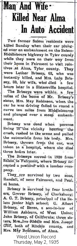 Born: 1849 5 Died: 1893 5 Buried: in Pine Grove Cemetery, Berea (Co Rd 7-26), Ritchie Co, WV 3 Father: Mother: NotesM Child 1: Luther Brissey Born: ca 1872 6 Died: Apr-28-1935 in Tyler Co, WV 6 Cause of death: automobile accident 6 Resided: in Fairmont, Marion Co, WV Resided: until 1920 in Salem, WV 6