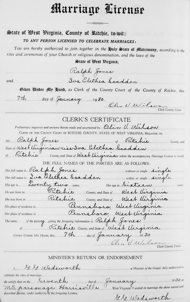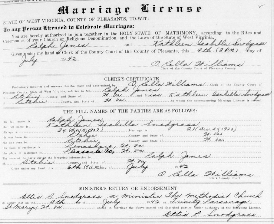 Jul-28-2018Husband: Ralph Jones Born: Nov- 5-1907 in Washburn, Ritchie Co, WV 1,2,3,4,5 Died: Nov- -1978 3,4 Buried: in Mt. Harmony Masonic Cemetery, Pennsboro, Ritchie Co, WV 6,7 Resided: in Pennsboro, Ritchie Co, WV 8,2,5 Census: 1920 in Clay District, Ritchie Co, WV Census: 1910 in Osborne Co, KS Father: Creed S. Jones (1886 - 1961) Mother: Gay A. Wade (1883 - 1955) Other spouse 2 Other spouse 3