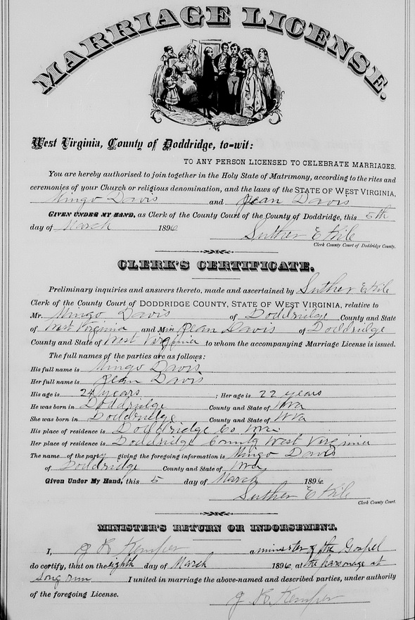Wife: Mary Imogene "Jean" Davis 3 Also known as: Jean Davis 2,3 Married: Mar- 8-1896 in Doddridge Co, WV 2,1