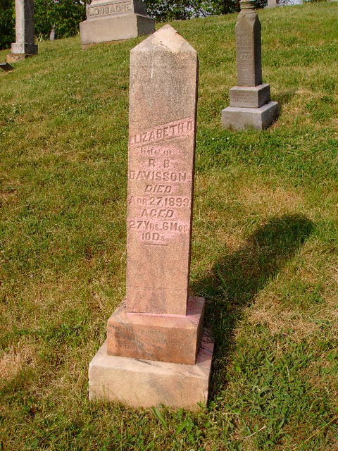 Sources: (1) Russell Lee Davisson, The Davissons - A History and Genealogy, McClain Printing Co, Parsons, WV (1993), p. 204. (2) Donald Edward Ramage, Doddridge County Cemeteries, Vol. I, 4117 Almaville Rd, Smyna TN 37167 (1988, rev. 1999) (3) Russell Lee Davisson, The Davissons - A History and Genealogy, McClain Printing Co, Parsons, WV (1993), pp. 166-168, 205. (4) West Union Herald-Record, 1/10/1978, p. 7. (5) Doddridge County Marriage Records, West Union, WV. (6) Doddridge County Birth Records, West Union, WV. (7) Doddridge County Death Records, West Union, WV, Identified as Elizabeth O. Davisson, married, age 26y 6m 10d, died Apr 27 1897 at Morgansville, cause of death pernicious anemia, burial at Archbold Cemetery. (Note: Age at death on headstone is 27y 6m 10d.), DR p. 120. (8) Headstone. (9) Doddridge County Death Records, West Union, WV. (10) Russell Lee Davisson, The Davissons - A History and Genealogy, McClain Printing Co, Parsons, WV (1993), p. 223. (11) West Virginia Deaths Index, 1853-1973 [database on-line], Ancestry.com. (12) Birth record of daughter. (13) Death record of daughter. (14) 1920 Census, Harrison County, WV. (15) Doddridge County Marriage Records, West Union, WV, Identified as Fred Husk, 28, b. & res. in Doddridge Co; and Ila Davisson, 19, b. & res. in Doddridge Co. Married Jan 30 1916 "at Residence of Bride at Harlin W.Va." (Note: Article in West Union Herald-Record of Jan 10 1978, p. 7, incorrectly states marriage date as Jan 1 1916.), MR Bk 9, p. 477. Event Notes Note (1) Age 27y 6m 10d on headstone calculates to a birth date of Oct 17 1871, while age 22 in Dec 1895 marriage record would put birth in about 1873, as does age 7 in 1880 Census. But her birth record shows that she was born on Oct 17 1872.Name Index