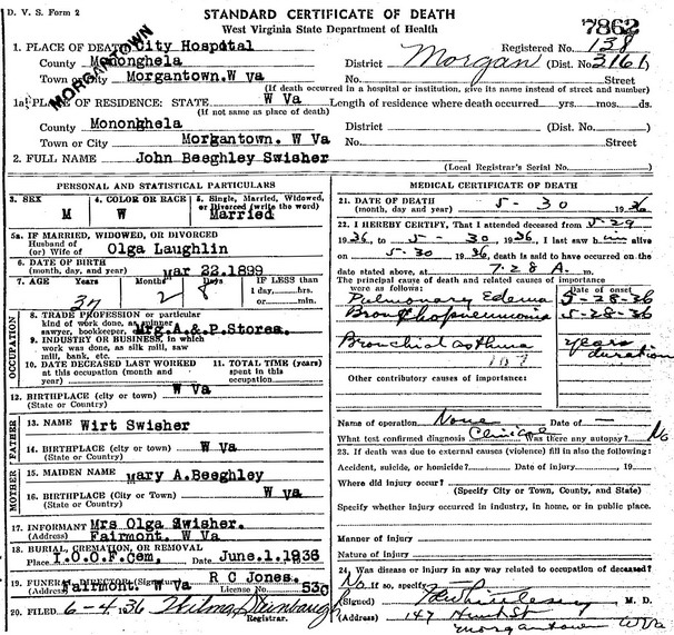 Jul-28-2018Husband: John Beeghley Swisher Born: Mar-22-1899 1 Died: May-30-1936 in Morgantown, Monongalia Co, WV 1 Buried: IOOF Cemetery 1 Occupation: manager, A&P grocery stores 1 Father: Wirt Swisher (1874 - 1959) Mother: Mary Adeline Beeghley (1873 - 1940)